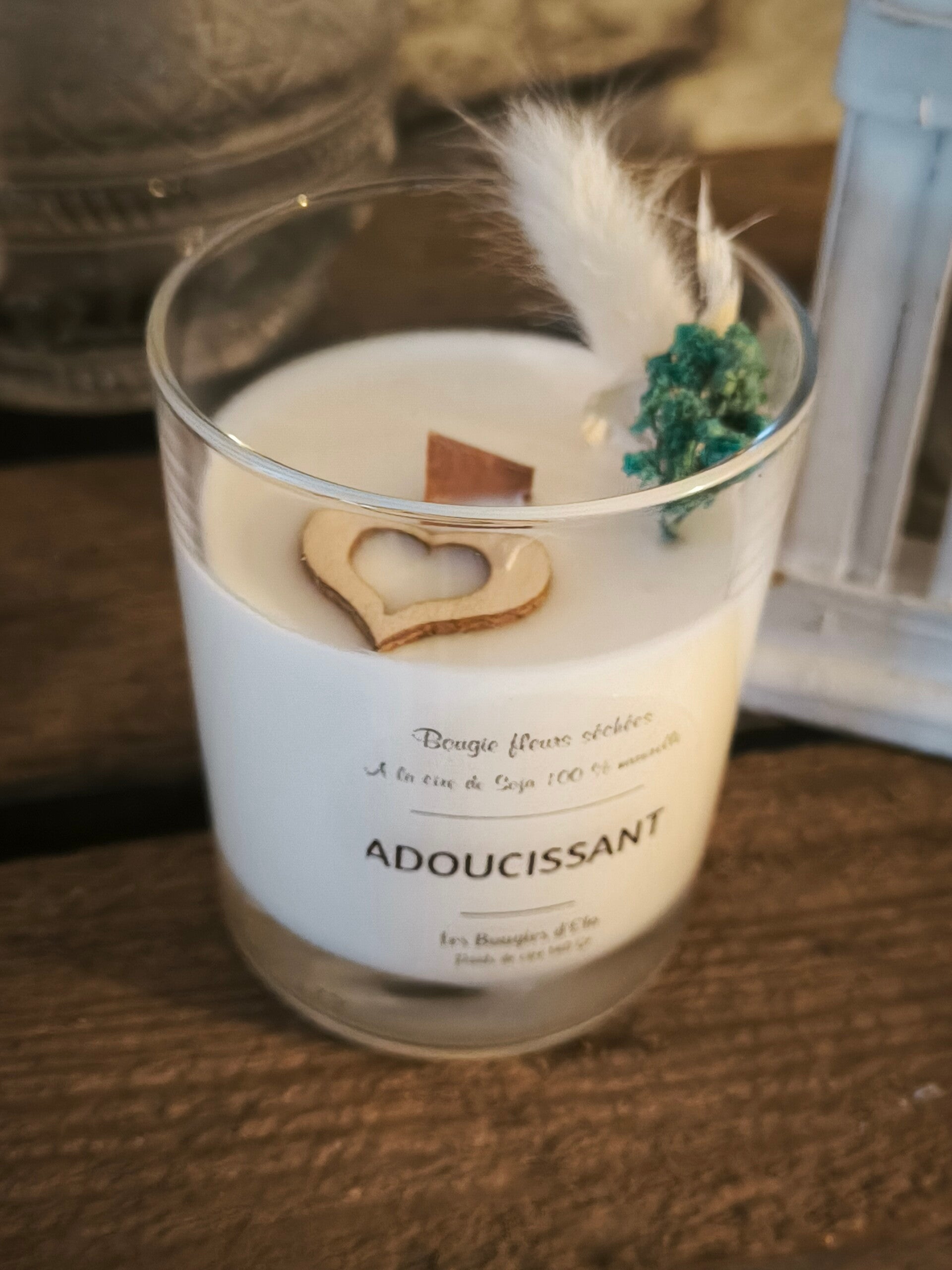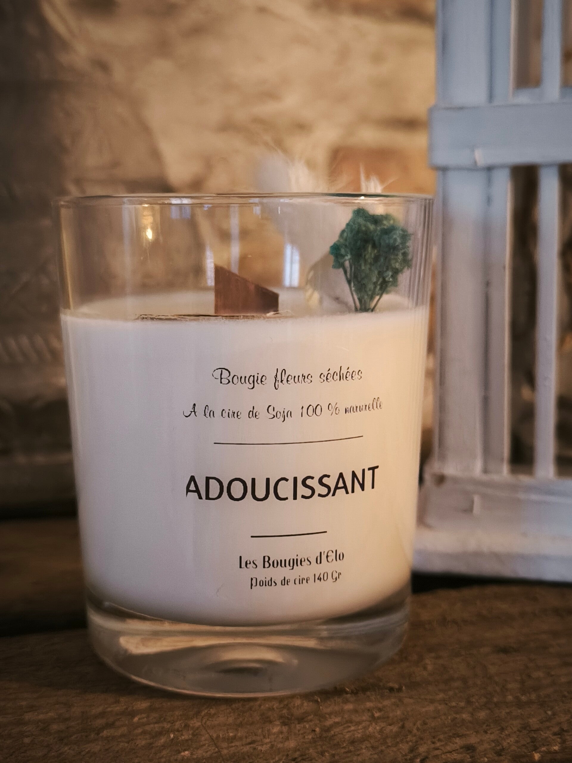 Plongez votre intérieur dans une atmosphère douce, propre et réconfortante avec la bougie Adoucissant de Les Bougies d’Elo.