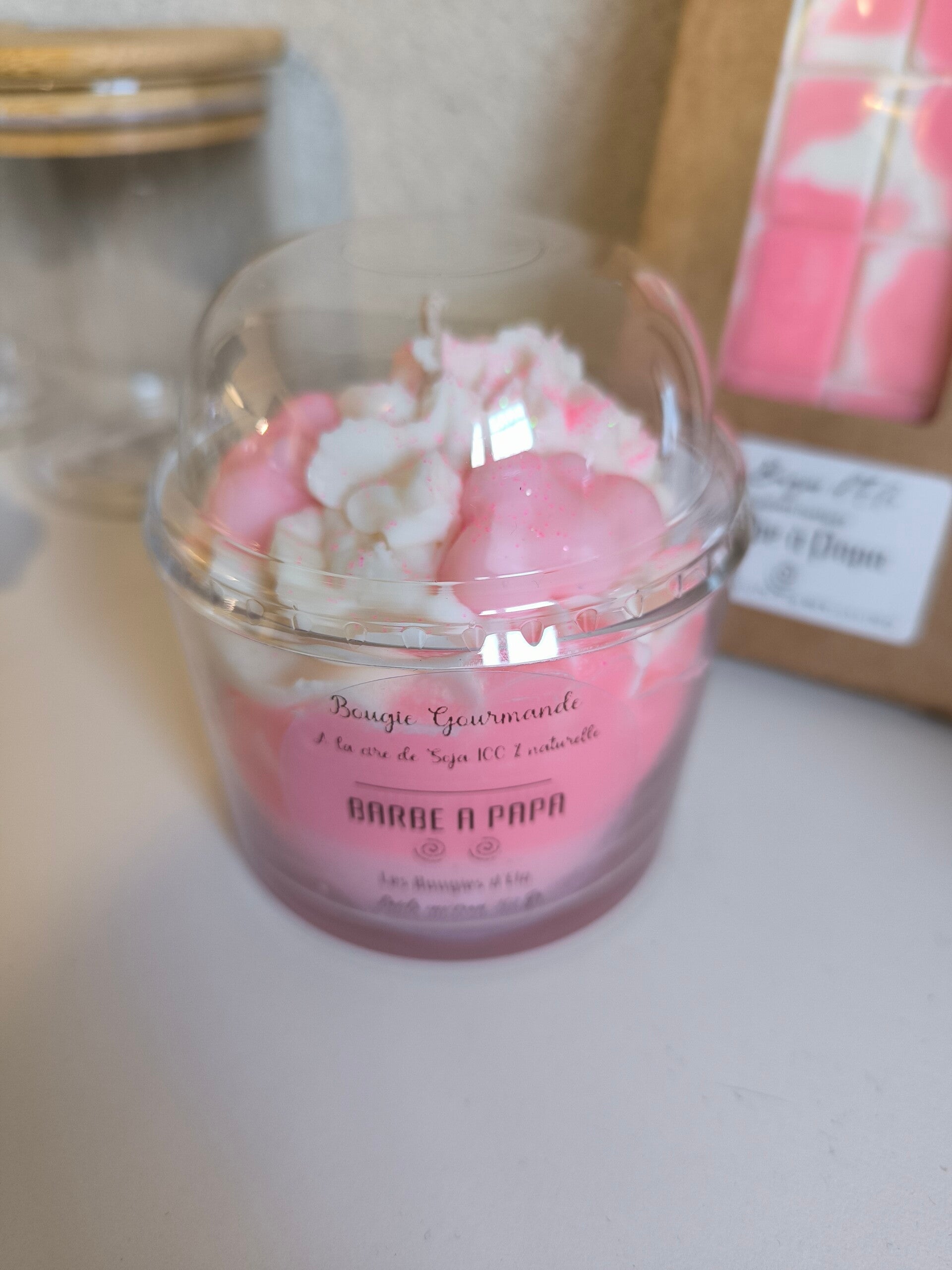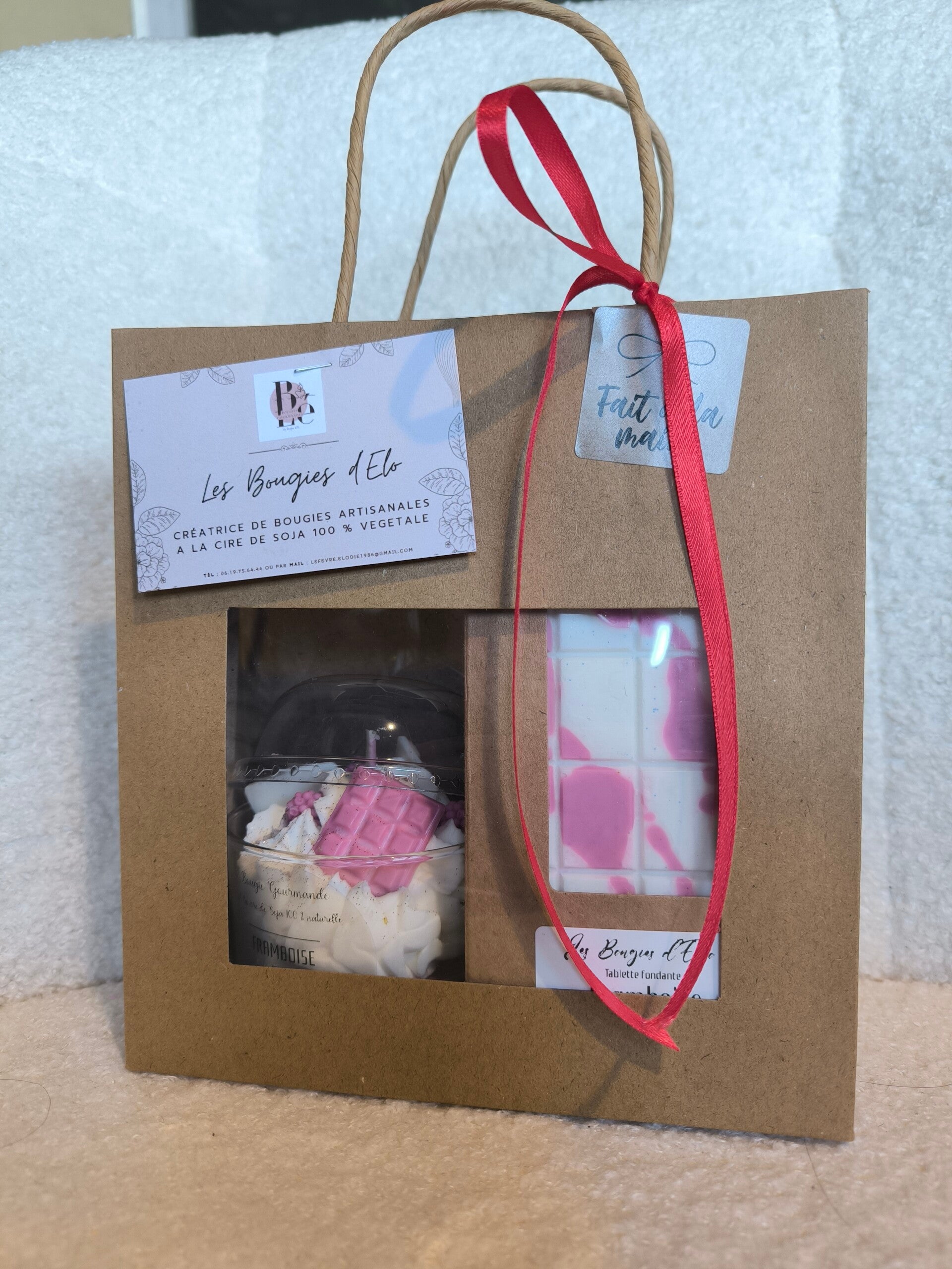 Un coffret gourmand composé d’une bougie chantilly parfum framboise et de sa tablette de fondant, fait main avec amour